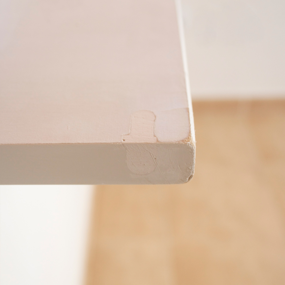 Encolé y arreglé la tabla de ikea y rellené los agujeros de «balda» con aguaplast. No es muy pro, pero era lo que tenía ¡y me ha dado el avío! Una vez seco lije y dejé los cantos más irregulares y redonditos para que no desentonara tanto con las patas-cosa.