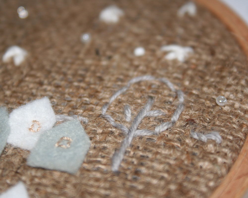 Un bastidor, tela de saco de la que uso para envolver algunos pedidos, cuentas de cristal de los cupcakes de crochet, hilos de los de ganchillo y un poco de lana, agujas, hilo de coser y unos trocitos de fieltro… Horas de poca luz y salir a hacer fotos bajo la lluvia ¡Tachán! Algo decente. ¡Uf!