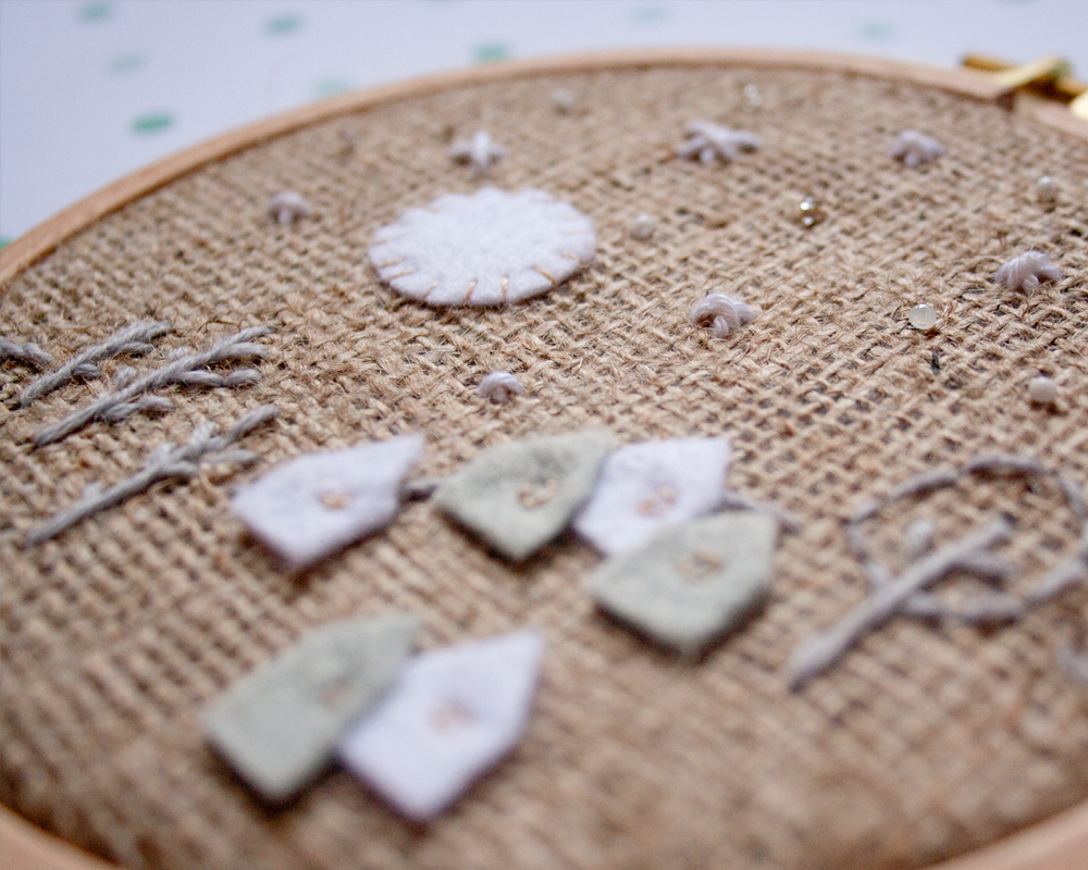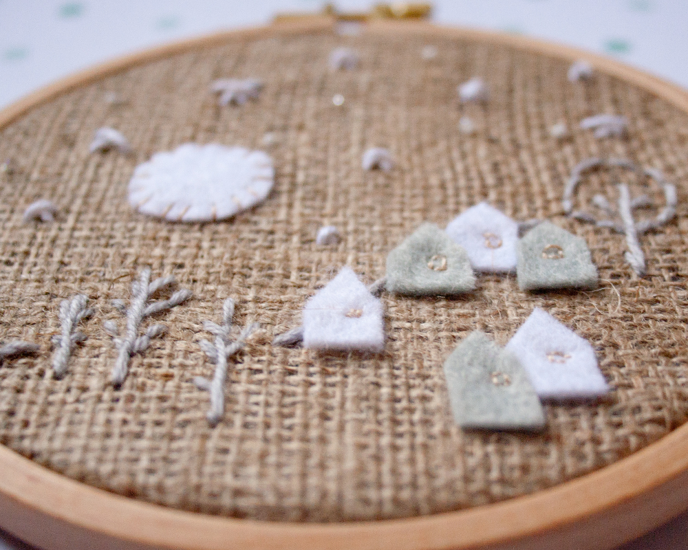 Siiii!!! Eres de las mías! Jajaja… Mira que me siento tan identificada con la historia: vamos que mi pandereta y tu bastidor son la pareja perfecta! Pero… señorita déjame decirte que te ha quedado fantástico: yo soy muy fan de la tela de saco… y el pueblecito que te inventaste ha quedado muy bonito: además me gusta el contraste de la tela rústica con lo delicado de las puntadas…